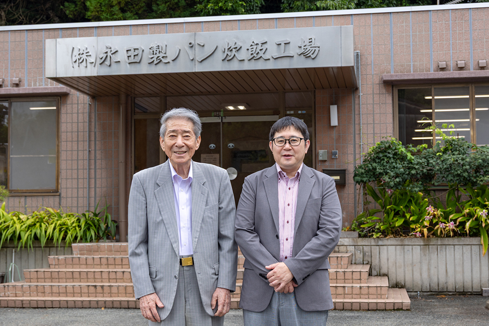 熊本県熊本市北区にある「株式会社永田パン」様は、1952年に製パン工場として創業しました。1977年からは学校給食の炊飯部門を開始し、現在では熊本市内の小中学校約80%以上に米飯を提供されています。1年ほど前、ライスフレンドスーパー全自動炊飯システムに更新。更新したきっかけや更新後の効果、今後の展望について、代表取締役 永田昭一様、専務取締役 永田義博様にお話を伺いました。